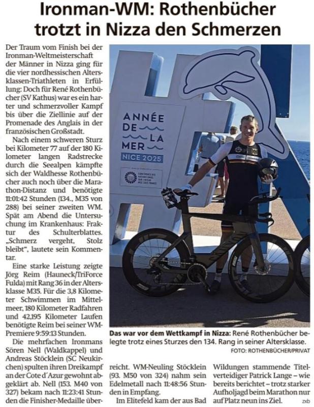 Unser Sportkamerad Andreas Stöcklein ist bei der Ironman Weltmeisterschaft der Männer in Nizza an den Start gegangen. Die Männer machen letztmals in Nizza den WTC Ironman Wettbewerb. Ab nächstem Jahr findet der Wettbewerb wieder auf Hawaii statt. Bericht von Andreas folg bestimmt bald .....