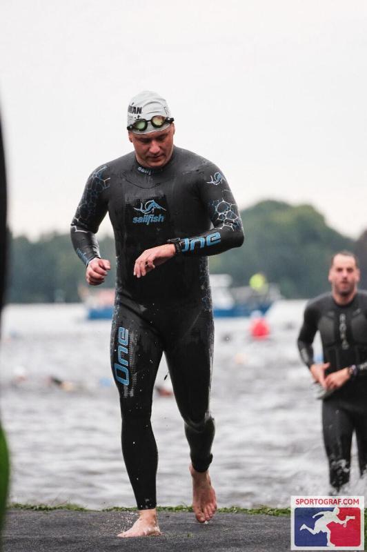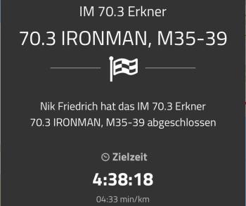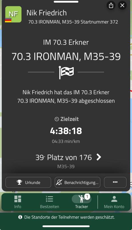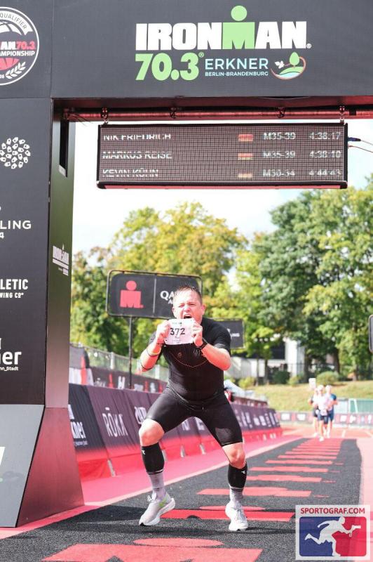 Das Wetter war sehr regnerisch und windig am Rennmorgen. Bei 13 Grad Außentemperatur und 19,1 Grad Wassertemperatur war das Schwimmen sehr angenehm. Hatte allerdings Probleme bei der Orientierung und es war ein ziemliches gekloppe während des Schwimmens. Nach 34 Minuten war ich aber dann doch recht zufrieden. Wechsel aufs Rad lief super. Die ersten Kilometer führen durch die Stadt Erkner, durch den Dauerregen war es ziemlich glatt auf den Straßen. Nachdem ich bei Kilometer 4 die ersten beiden Athleten am Streckenrand liegen gesehen hatte, war für mich „Safety First“ angesagt. Die Verpflegung lief echt gut und ich konnte dann trotz der Bedingungen gut pushen und richtig viele Plätze gut machen. Nach 2h18min abgestiegen. Wahnsinn! Damit hatte ich tatsächlich nicht gerechnet. In T2 nochmal frische trockene Socken angezogen und dann ging es zum Laufen. Ich habe mir bewusst vorgenommen die erste Runde nur nach Gefühl zu laufen. Als ich dann das erste Mal auf die Uhr schaute, konnte ich es auch dort kaum glauben…so schnell bin ich im Training nicht gelaufen. 😅 So konnte ich Runde für Runde die Pace halten. In der vierten und letzten Runde wollte ich dann nochmal versuchen anzuziehen aber schneller ging es nicht mehr…aber auch nicht langsamer. 😉 Der Moment, auf die Finishline zu kommen war wirklich Atemberaubend. Als ich oben meine Finishtime gesehen hatte war tatsächlich mein erster Gedanke das kann unmöglich stimmen. 🧐 Aber beim Abdrücken der Uhr stand das gleiche Ergebnis. 4h38! Ziel war sub5…und das war es…und zwar deutlich! 💪🏻 Unterm Strich war es ein absoluter Sahnetag bei schwierigen Bedingungen. Ich bin Mega glücklich und zufrieden! Vielen Dank an Marc, der mich nach meinem emotionalen Tiefpunkt der Saison, in Erlangen, rausgeholt und 100 prozentig vorbereitet hat. Jetzt geht es in die Saisonpause um dann mit frischem Kopf in die Vorbereitung für den IRONMAN Frankfurt zu starten.
