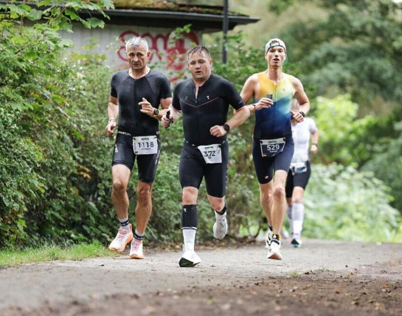 Unseren Sportkameraden Nick Friedrich hat es nach Berlin verschlagen, um dort im Stadteil Erkner eine Mitteldistanz zu absolvieren. Rennberiicht von Nick: Das Wetter war sehr regnerisch und windig am Rennmorgen. Bei 13 Grad Außentemperatur und 19,1 Grad Wassertemperatur war das Schwimmen sehr angenehm. Hatte allerdings Probleme bei der Orientierung und es war ein ziemliches gekloppe während des Schwimmens. Nach 34 Minuten war ich aber dann doch recht zufrieden. Wechsel aufs Rad lief super. Die ersten Kilometer führen durch die Stadt Erkner, durch den Dauerregen war es ziemlich glatt auf den Straßen. Nachdem ich bei Kilometer 4 die ersten beiden Athleten am Streckenrand liegen gesehen hatte, war für mich „Safety First“ angesagt. Die Verpflegung lief echt gut und ich konnte dann trotz der Bedingungen gut pushen und richtig viele Plätze gut machen. Nach 2h18min abgestiegen. Wahnsinn! Damit hatte ich tatsächlich nicht gerechnet. In T2 nochmal frische trockene Socken angezogen und dann ging es zum Laufen. Ich habe mir bewusst vorgenommen die erste Runde nur nach Gefühl zu laufen. Als ich dann das erste Mal auf die Uhr schaute, konnte ich es auch dort kaum glauben…so schnell bin ich im Training nicht gelaufen. 😅