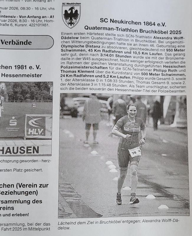 Unsere Sportkameradin Alexandra Wolff-Dädelow hat heute, an ihrem 46. Geburtstag, in Brucköbel eine olympische Distanz absolviert. Zudem wurde dort auch die Hessische Polizeimeisterschaft durchgeführt. Unsere beiden Polizeibeamten Thomas Klement und Philipp Roth haben dort die Farben des SC-N vertreten und natürlich auch ihre Dienststellen.