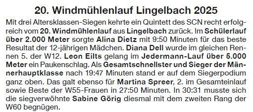 Beim Windmühlenlauf in Lingelbach waren auf der 5 km Laufstrecke Leon Eilts, Martina Spreer und Sabine Görig unterwegs. Unsere beiden junden Damen Alina Dietz + Diana Dell haben die 2 km Laufstrecke unter die Füße genommen.