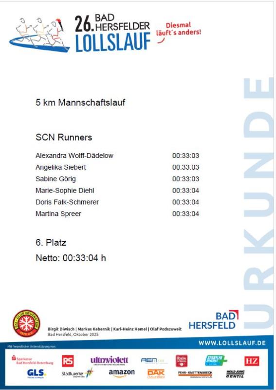 Uner der Angabe SCN Runners haben unsere Sportkameradinnen Angelika Siebert, Doris Schmerer, Sabine Görig, Alexandra Wolff-Dädelow und Marie-Sophie Diehl einen 5 km Mannschaftslauf in Bad Hersfeld absolviert. Stephar Raatz und Oliver Schöllmann waren beim 10 km Lauf dabei. Nik Friedrich hat die 5 km Strecke bewältigt.