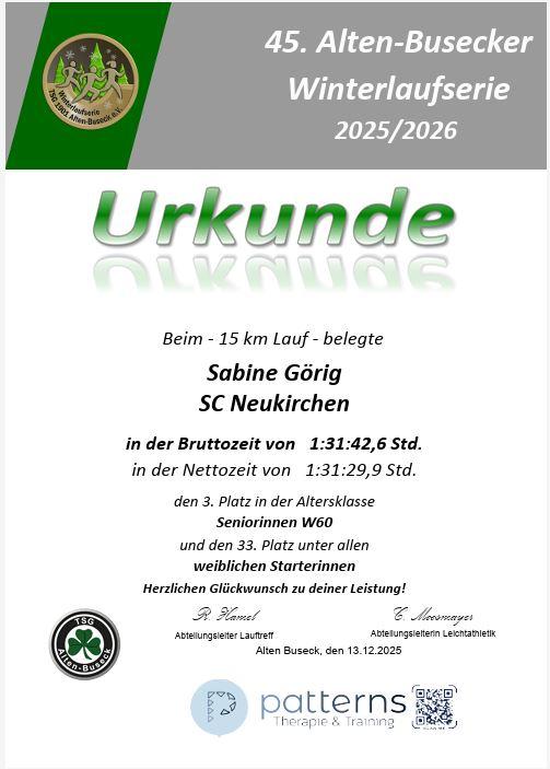 Unsere Sportkameradin Sabine Görig hat am 2. Lauf der Winterlaufserie in Alten-Busek teilgenommen und die 15 km Laufstrecke abgearbeitet.