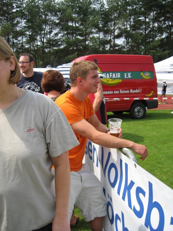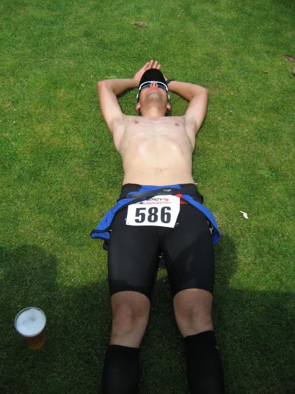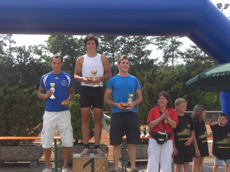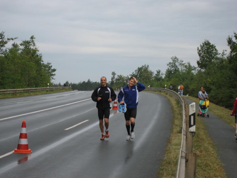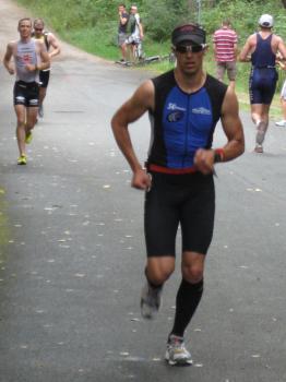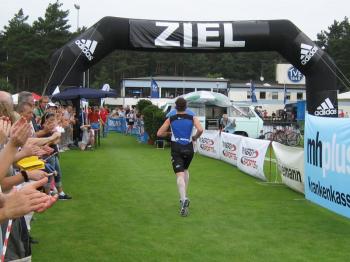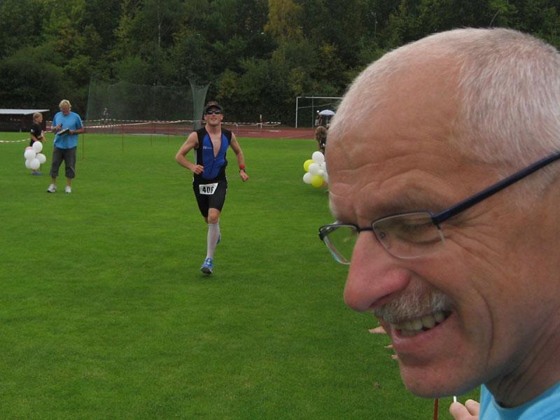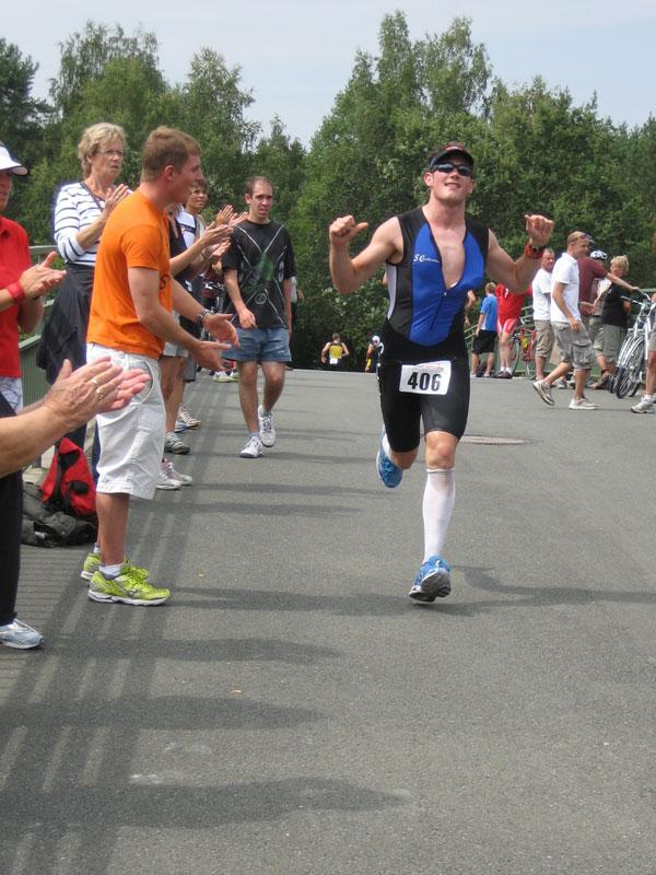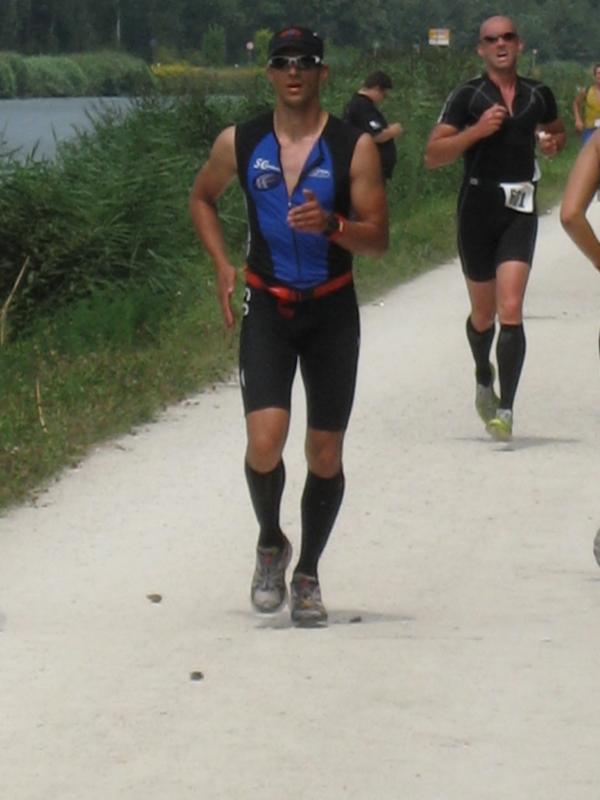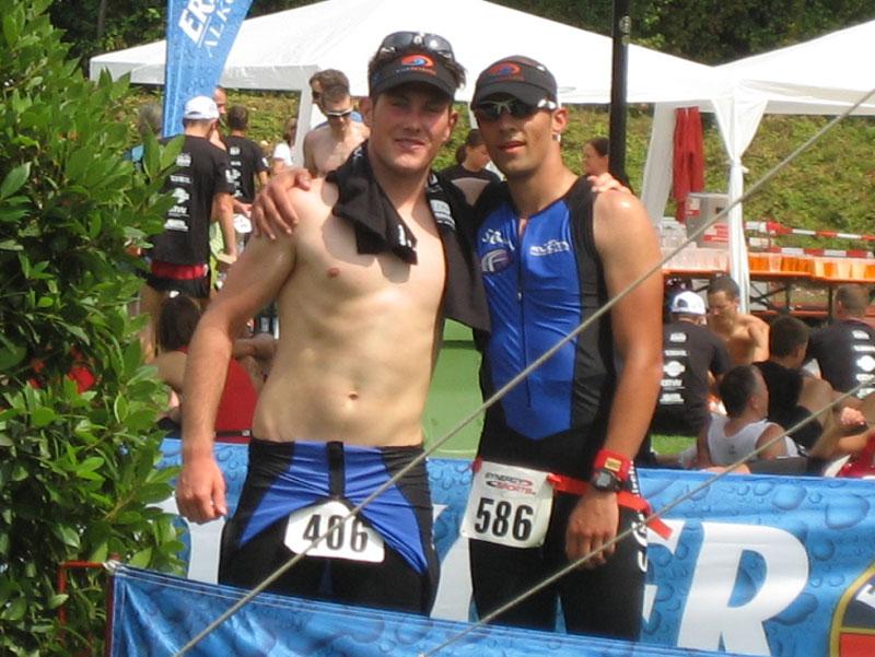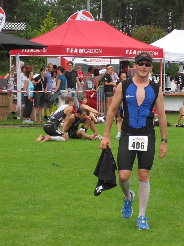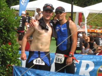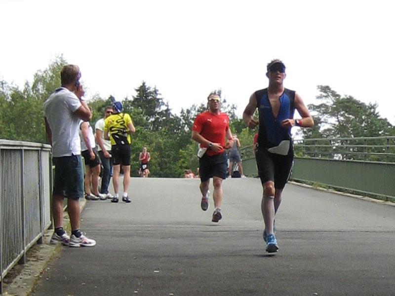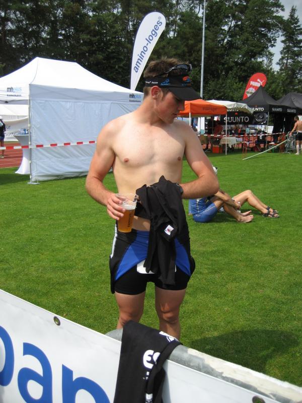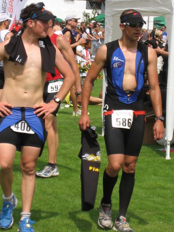 Am Freitag, den 07.08. fuhren Erik und Max ins schöne Frankenlang zum Erlanger Mitteldistanz Triathlon. Zwei Tage vor dem Start konnten wir uns bei bestem Sonnenscheinwetter optimal auf das Umfeld einstimmen und die Radstrecke schon einmal abfahren, was immer zu empfehlen ist. Sonntag morgen dann klingelte um 5:50 Uhr der Wecker: Aufstehen, Frühstücken und ab in die Wechselzone zum Einchecken. Hatten wir doch die vorherigen Tage einen wunderschönen, wolkenlosen Himmel gehabt, musste es natürlich am Wettkampftag anfangen zu regnen. Aber das Wetter sollte unsere Stimmung nicht trüben, schließlich waren wir nach strenger Eiweiß-Diät und Gerhards harter Vorbereitung bestens gerüstet. Doch der eigentliche „Eincheck-Stress“ sollte noch kommen... Jeder von uns kennt die Prozedur und wir waren auch durch andere Teilnehmer vor den äußerst strengen bayrischen Kampfrichtern gewarnt worden. Erik checkte zuerst ein und durfte passieren, kurz darauf kam Max an die Reihe. Am Rad war alles in Ordnung, aber der Helm wollte dem Kampfrichter einfach nicht gefallen. So empfand er einen winzigen Haarriss im Helm als ausschlaggebend Max nicht starten zu lassen. Obwohl man doch satte zwei Stunden vor Beginn einchecken wollte, kann so ganz schnell Hektik aufkommen. Nach aussichtsloser Diskussion kam dann ein Radhändler herbeigeeilt, der „ganz zufällig“ noch Helme verkaufte. So musste sich Max zu einem Wucherpreis erst einmal einen neuen Helm kaufen, um endlich starten zu dürfen... Pünktlich um 9:05 Uhr: Anpfiff der 1. Startgruppe zur Erlanger Mitteldistanz über 2000m schwimmen/80km Rad/20km Laufen. 10 Minuten später folgte der Start der 2. Gruppe und somit auch für Erik. Beide SCN-Jungs legten schon einmal eine tolle Schwimmleistung vor im Main-Donau Kanal (Max 27:11, Erik 33:58) und damit den Grundstein einer ungeahnten Gesamtzeit. Das Schwimmen machte richtig Spaß und war sehr zuschauerfreundlich. So konnten Erik und Max ständigen Blickkontakt zu unseren einmaligen Supportern Gerhard, Bodo, Matze und Jonas halten. Nach dem Schwimmausstieg musste dann die für beide wohl längste Wechselzone überhaupt von satten 360m überwunden werden, bis sie auf ihre sorgsam präparierten Renner steigen konnten. Das Radfahren war wahrscheinlich der sportliche Höhepunkt für beide Athleten. Die Strecke hat nur zwei nennenswerte Anstiege (ings. ca. 500 Höhenmeter), der Belag ist meistens butterweich, aber dennoch erwies sich der Wind als größter Widersacher gegen den Kampf mit der Uhr. Trotzdem konnten Rösinator und Mighty Max überzeugen und fuhren den besten Radsplit ever (Erik 2:09h, 36,5km/h und Max 1:58h, 40km/h). Beim 2. Wechsel bewies der Veranstalter seine hervorragende Organisationsplanung, indem den Starten die Räder abgenommen, die passenden Beutel mit Laufutensilien gereicht, und im Wechseltzelt alles bereitgestellt wurde. Der anschließende Lauf sollte dann aber beiden Athleten die restlichen Reserven rauben. Während der ersten Radrunde hatte der Regen schon wieder aufgehört und es wurde immer heißer, schließlich noch über 30 °C. Doch auch während der letzten Disziplin war die 13x Verpflegung an der Laufstrecke spitze und alle konnten sich ausreichend mit Cola, ISO und Wasser versorgen. Die 2 Laufrunden durch Wald und Stadion waren aber alles andere als flach und leichtläufig, da die Waldwege permanent unangenehm bergauf und ab verliefen, eine große Brücke über den Kanal 4 mal überquert und nach den beiden Stadionrunden jeweils eine steile Treppe bewältigt werden mussten.