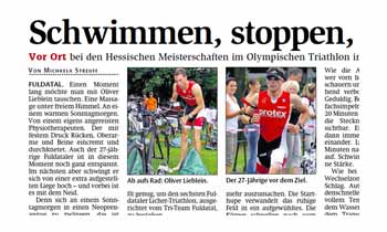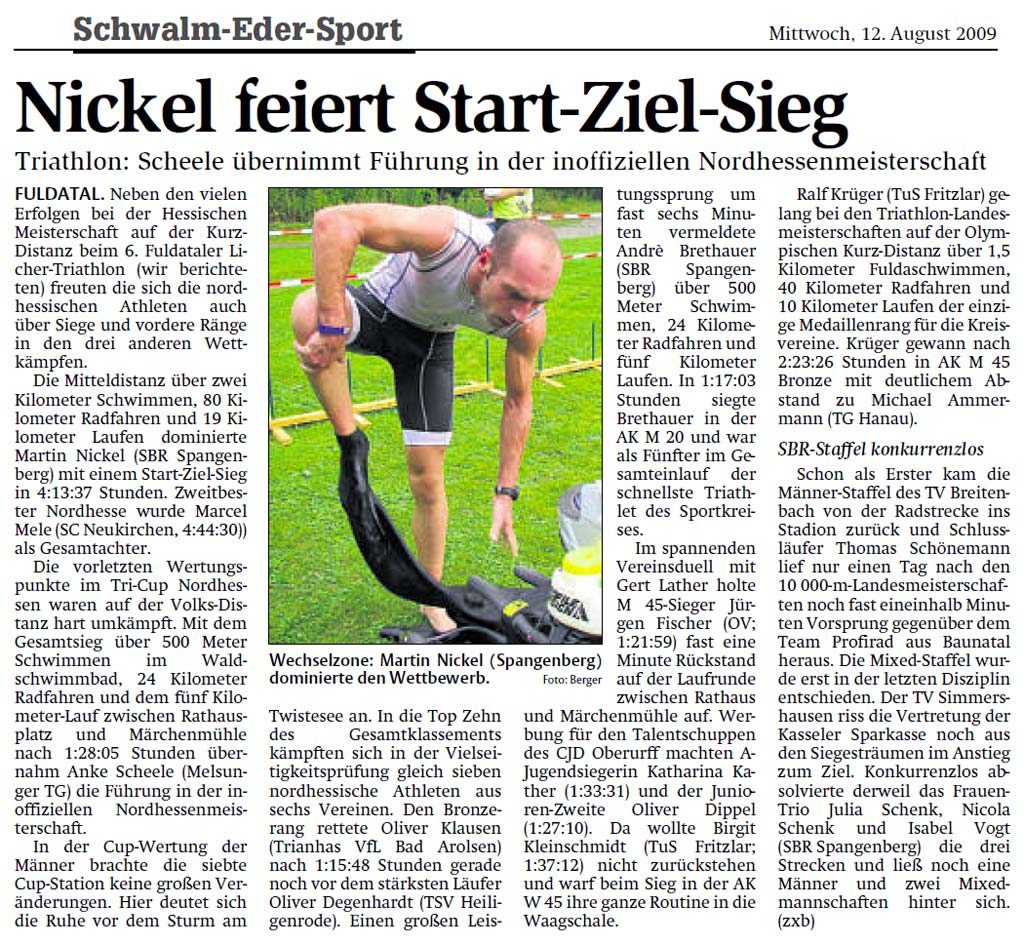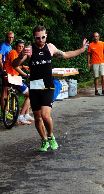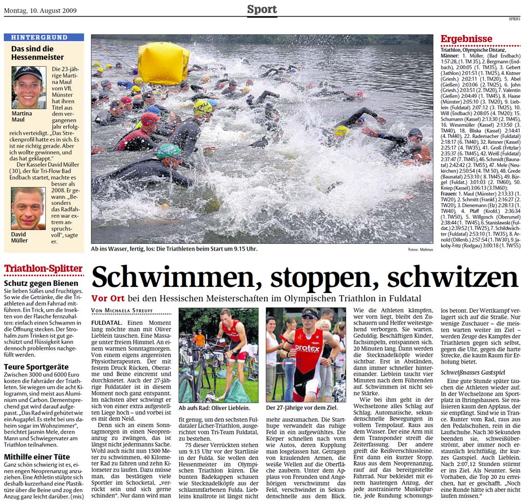 Am 09.08.2009 fiel für Opa / Papa Mele (Michele Mele) der Startschuss zum Fuldatal Triathlon. Micke hat sich für die Kurzdistanz (1,5/40/10) und Hessenmeisterschaft gemeldet und celMar (Marcel Mele) dachte sich, wenn schon dann richtig fertig machen und startete über die Mitteldistanz (2/80/20). Für ihn fiel um 9.00 Uhr der Startschuss in der doch ziemlich kalten und unglaublich dreckigen Fulda. Für Micke ging es um 9.15Uhr los. Nach 34:45 Minuten und sch… Schmerzen im Ellbogen stieg Marcel aus der Brühe, Micke hatte es nach 23:28 Minuten geschafft sich durch Blätter, Stöcke und was sonst noch so alles da drin rum schwamm zu kämpfen. Nun ging die Höllentour erst los… Marcel musste den Hügel von 18% 5mal überqueren und Micke 2mal. Wie selber erwartet fiel Marcel das Radeln ziemlich schwer, konnte aber nach 2:44:53 Std. (incl. Wechselzeiten) vom Rad steigen. Micke hatte heute einen seiner wohl schwärzesten Tage erwischt. Nicht nur, dass er eine Zeitstrafe für einen vermeintlich zu langen Überholvorgang bekam und in der zweiten Runde sehr schwer stürzte, so lotste Ihn zusätzlich auch noch ein Streckenposten falsch, so dass er noch eine Extrarunde drehen musste. Trotz allen Übels hat er sich durchgebissen und gefinisht. Währendessen drehte Marcel kontrolliert und ziemlich locker seine Runden. Völlig überraschend kam Markus März, die treue Seele, vorbei, feuerte Marcel an und unterstütze ihn sehr an der Strecke. Danke dafür! Natürlich will er seine zwei liebsten und treusten Fans nicht vergessen, die wieder mal sehr tapfer mit dabei waren. In der letzten Runde hat Marcel dann noch mal ne Schippe draufgelegt und nach einer Laufzeit von 1:24:52 Std. und einer für ihn zufriedenstellenden Gesamtzeit von 4:44:30 Std. das Ziel erreicht.