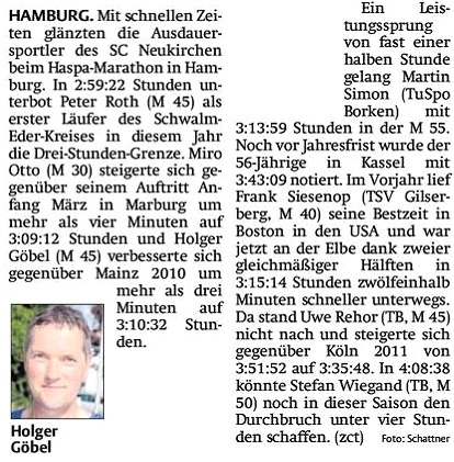 OK, kommt schon. Muss ja erstmal nach Hause kommen. Hamburg 8:15 Uhr, von der Hitze im Wetterbericht und dem Bericht vom Stadtlauf Neukirchen keine Spur. 10-12 °C, bewölkt, steife Brise aus Nordost (wie man im Norden sagt), optimale Bedingungen. Vom Hotel 100 m in die Startbox + kleiner Umweg zum Warmwerden natürlich. Wo sind eigentlich Mirco und Holger? Blick auch in die Umliegenden Startboxen leider vergeblich. Philipp (Zuschauer) hat Mirco später auf der Strecke entdeckt. 9:00 Uhr: Auf gehts. Nerven behalten und nicht gleich losrennen! Nach 5 km in den Gegenwind (echt spürbar). Zwei nebeneinander laufende Polizisten quatschen über ihren guten Zeitplan, also dahinter einreihen und Windschatten nutzen. Bei km 13 habe ich mich höflich und dankend von beiden verabschiedet. Bei Halbzeit erste Uhr an der Strecke (ich nehme keine mit), 1:30er Zeit, kann doch nicht sein?!... Jetzt machts richtig Spaß (Dank an Gerhard!!!), ab km 30 Rückenwind und ab in den "Tunnel". Der Mann mit dem 3-Stunden-Luftballon kommt näher. Wahnsinn: Noch einmal die 2 vor dem Komma! Hätte ich nicht für möglich gehalten. (Nebenbei): Philipp hat die letzten 11,5 km als "ausgeliehener" Staffelläufer mit dem gleichen km-Schnitt gelaufen, und das im "Slalom", da er eine Stunde später auf der Strecke war. Großes Lob! Fotos leider nur auf der Veranstalterseite.