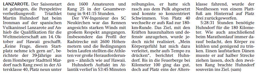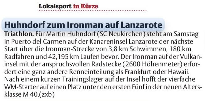 Martin Huhndorf Da bin ich mit einer kurzen Zusammenfassung vom Rennen. Zunächst Danke für die vielen Aufmunterungen die letzten Tage und Glückwünsche. Das macht den SCN aus !! Es war ein tolles Rennen. Einiges erinnert an Hawaii, vielleicht gibt das dem Rennen eine gewisse Note. Der Schwimmstart war erfolgreich. Ich hatte wenige Kontakte, was mich schnell in den Rhytmus brachte. Zwei fast gleiche Rundenzeiten zeigen einmal mehr, dass Harald alles richtig macht mit uns. Durch den AWA Gold Status hatte ich schon tolle Privilegien, somit hingen Beutel und Rad 1a. Wechsel also gut. Vor dem Radfahren und Laufen hatte ich schon Bammel. Ich war die letzte Zeit nicht immer mit mir zufrieden. Trotzdem lief das top. Nach Sturm die letzten Tage zeigte sich rücksichtsvoller. Kam mir entgegen. Top informiert beflügelten die Platzierungen zwischendurch. Somit fuhr ich nach 100km kraftvoll in die Feuerberge. Es soll eine Randnotiz sein, aber bei einer Abfahrt kurz vor dem "Gipfel" hatte ich am Hinterrad einen Durchschlag, platt. Schlauch gewechselt, Falte bemerkt, korrigiert, beim aufpumpen geplatzt. Einen Schlauch hatte ich noch, mehr Zeit genommen 😬, geklappt. Es muss erwähnt sein, ich habe 8:53min gebraucht. Schmälert nicht meine Zufriedenheit. Die letzten 60km geschwitzt, damit nix passiert, gut gegangen. Platz 1 in der WZ baute mich auf, aber der Lauf hatte einiges von Hawaii. Kam gut durch, müsste aber den Däne ziehen lassen. Nach hinten Platz gehabt, auch ein gutes Gefühl. Somit könnte ich mal wieder den Zieleinlauf voll genießen. Geht mir gut, jetzt Urlaub. Grüße nach Hause.